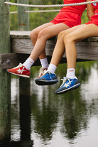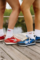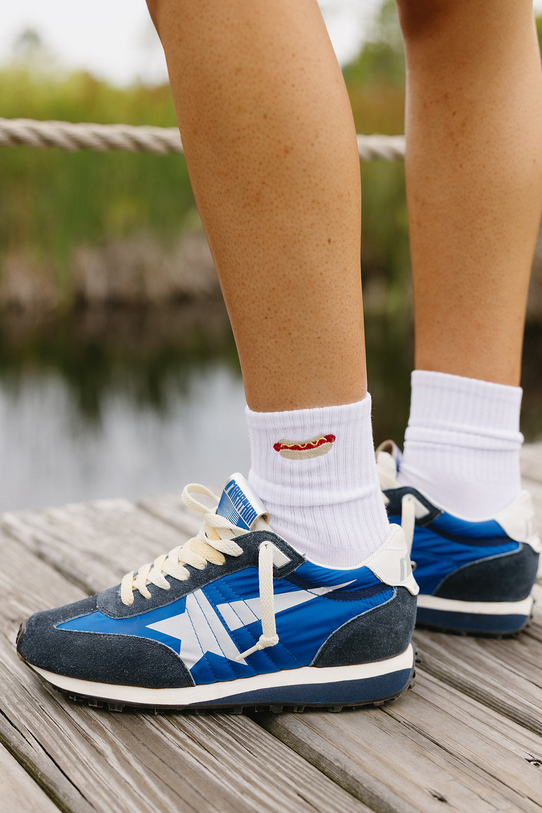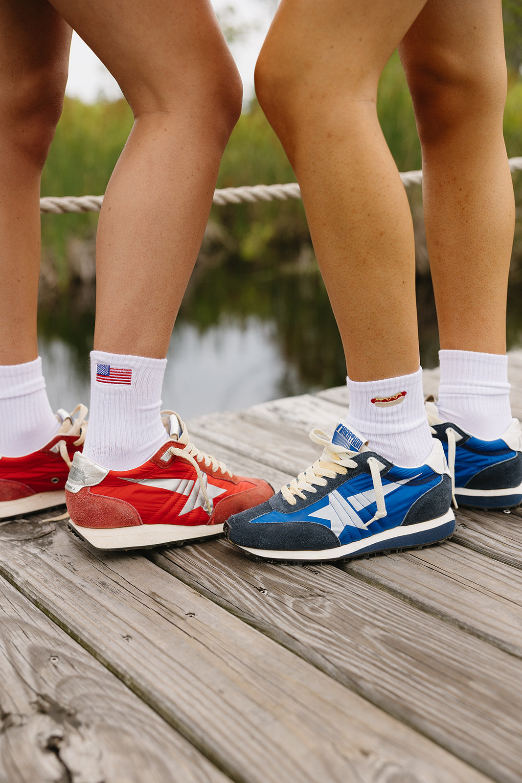 One pair of tube socks with an embroidered American Flag on one + a hot dog on the other! The perfect socks for summer.