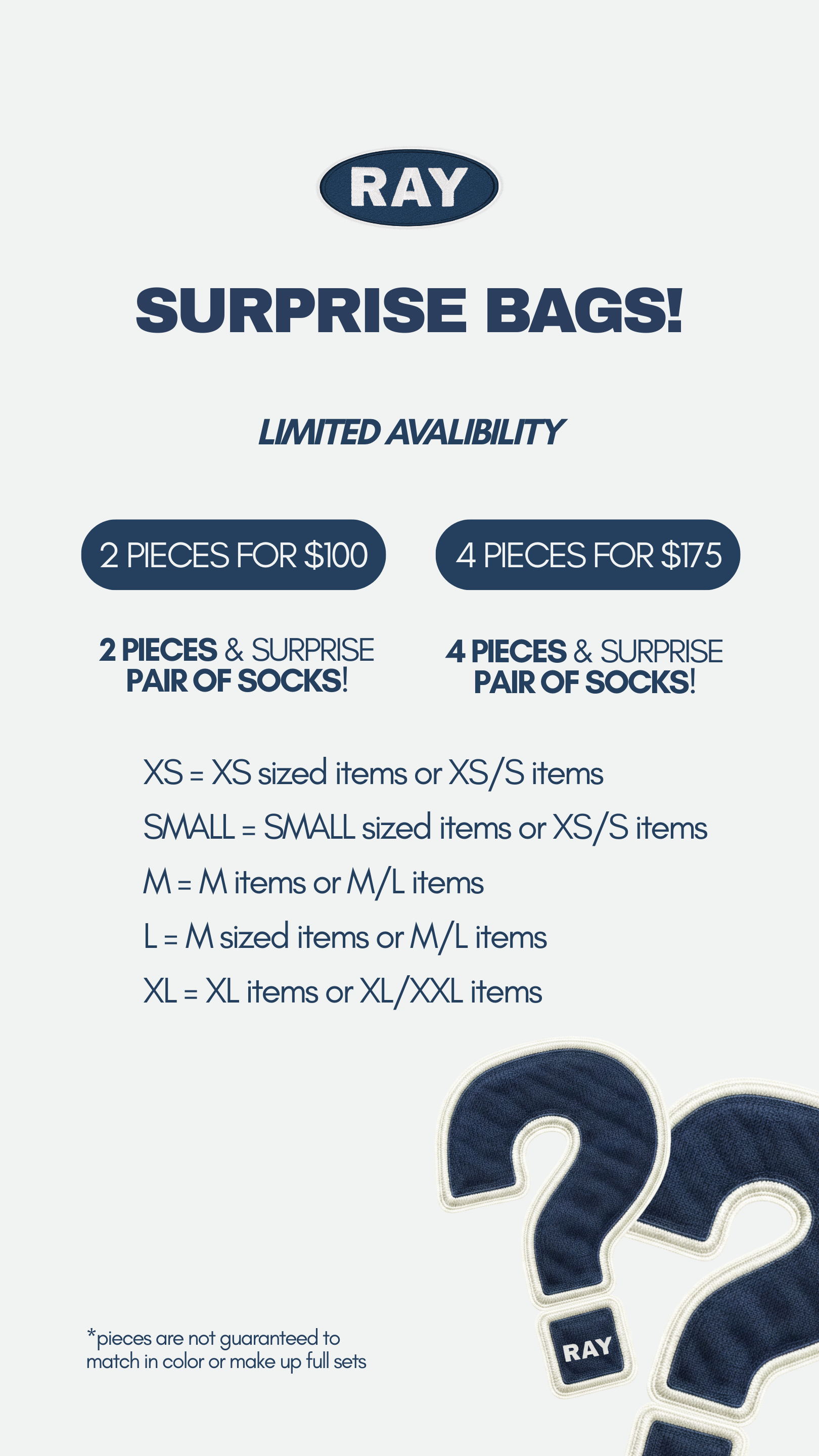Want a fun surprise? Our Surprise Bags are full of RAY. Choose whether you want 2 or 4 pieces + all Surprise Bags come with a surprise pair of socks! Pieces are not guaranteed to match in color or make up full sets.