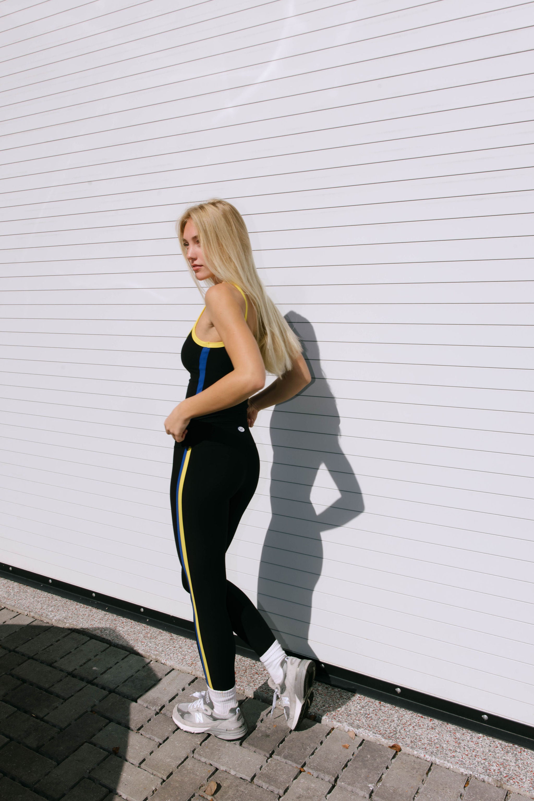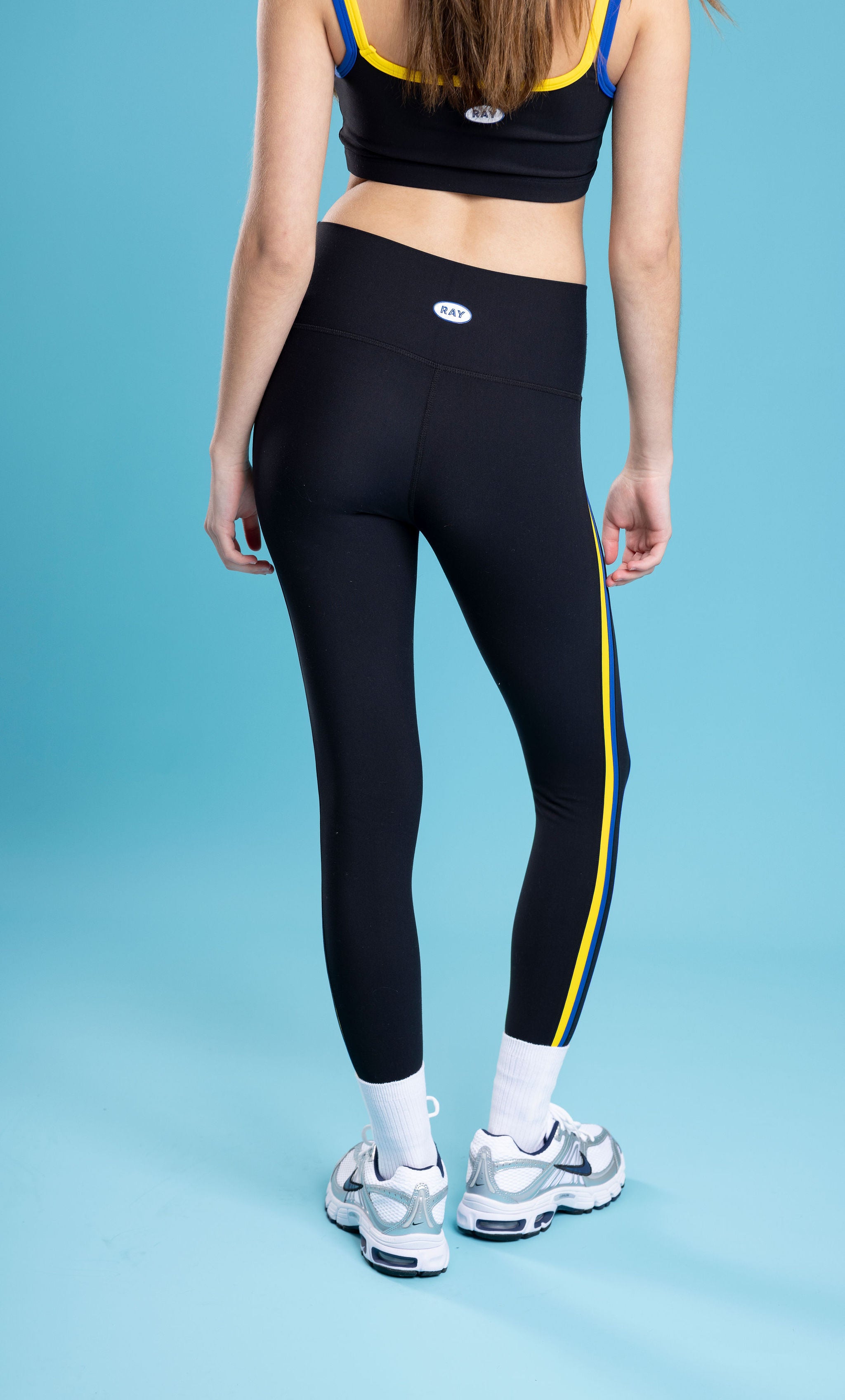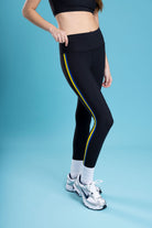 Details: Full length leggings with two-toned color block detail down the side.