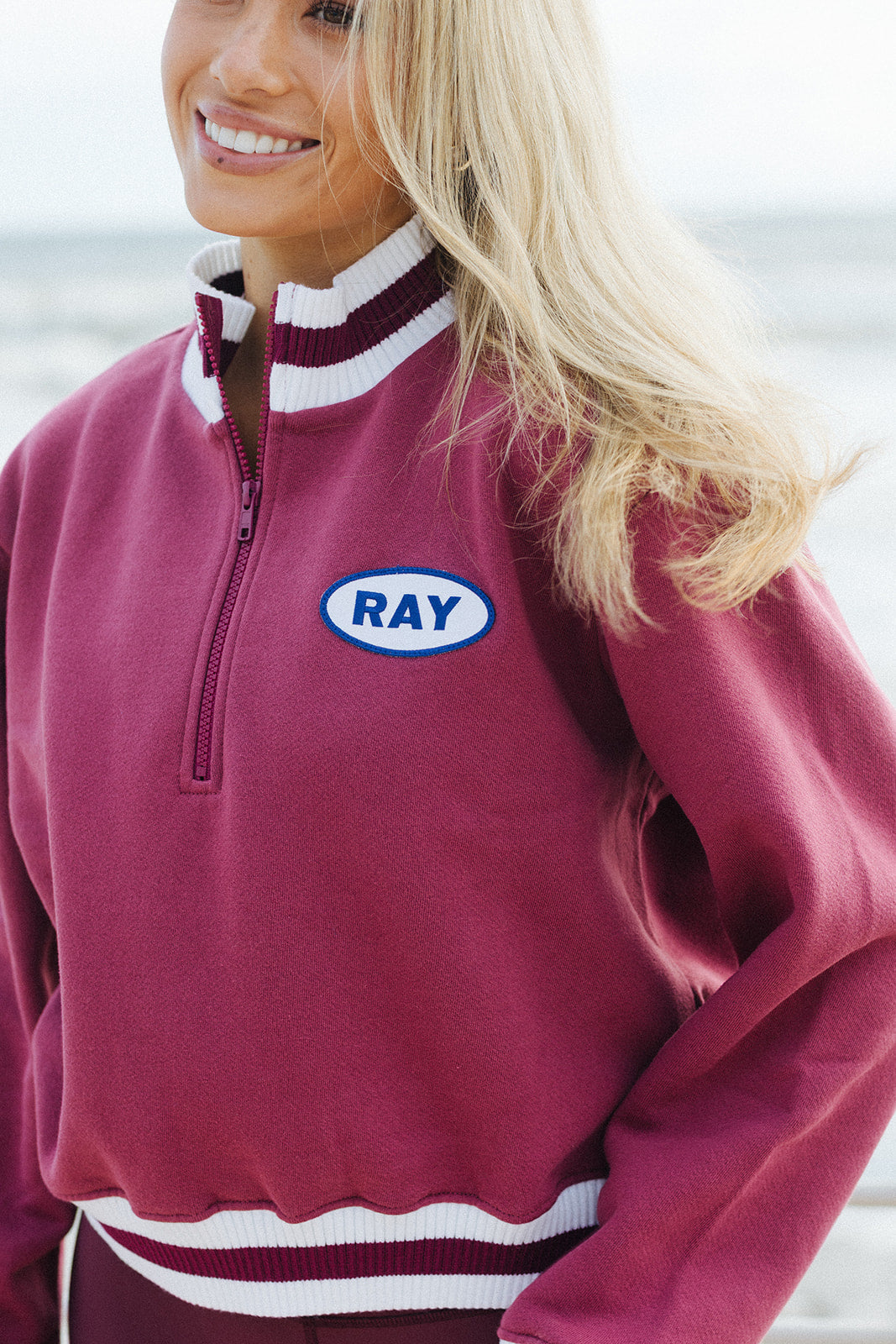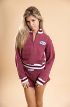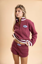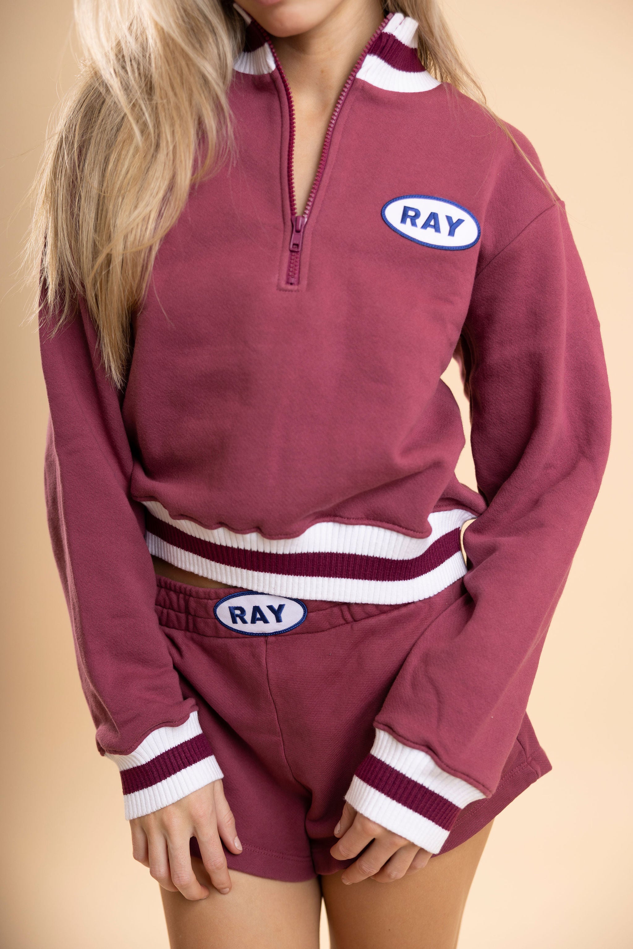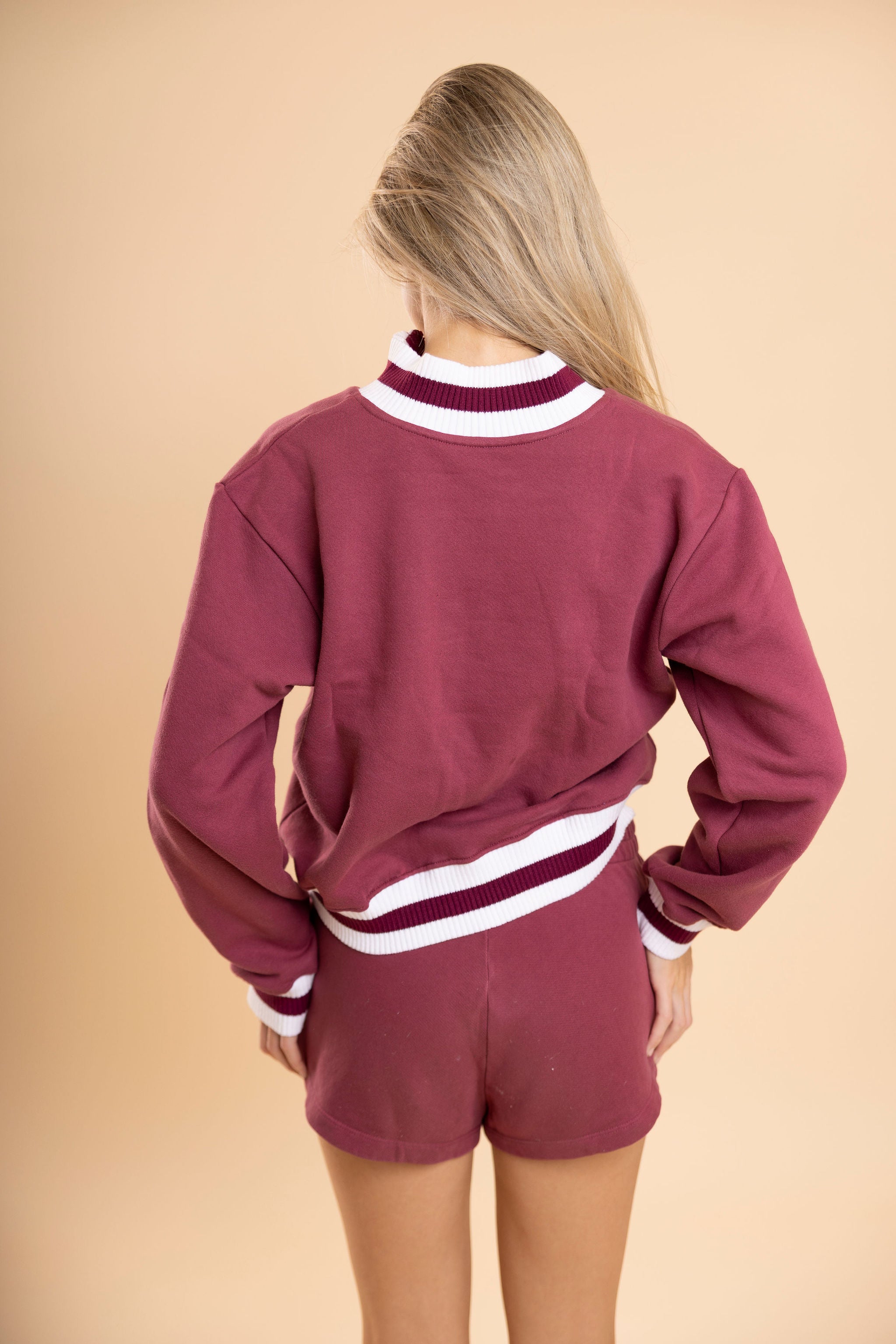 Details: Cropped quarter zip sweatshirt with a striped banding.