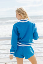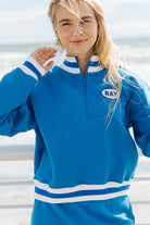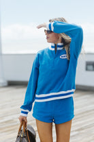 Details: Cropped quarter zip sweatshirt with a striped banding.